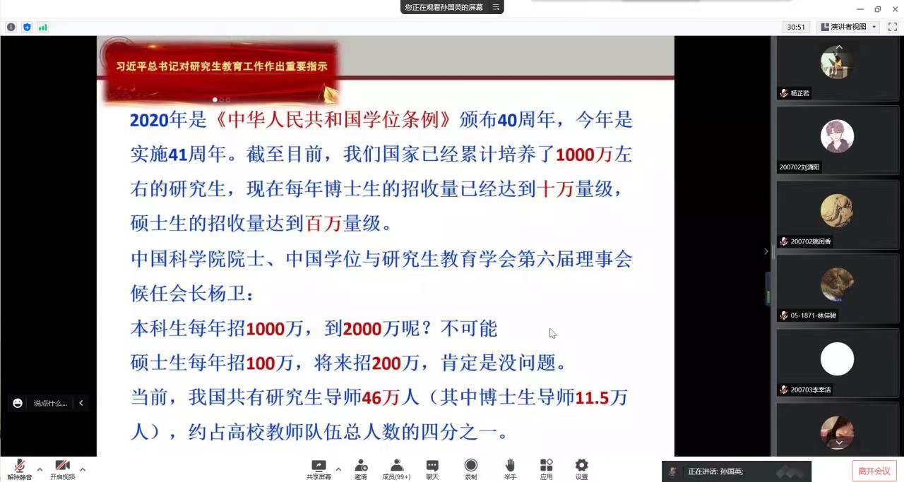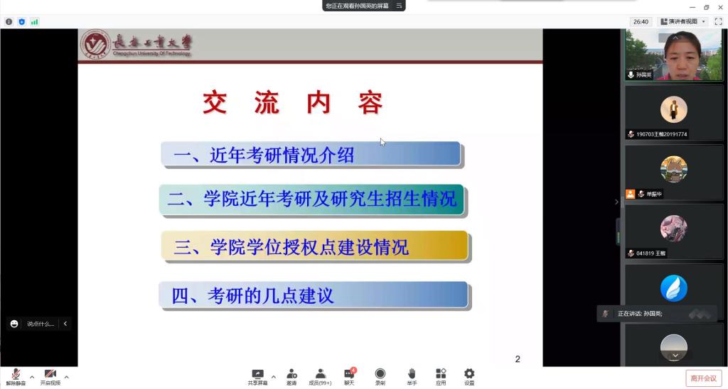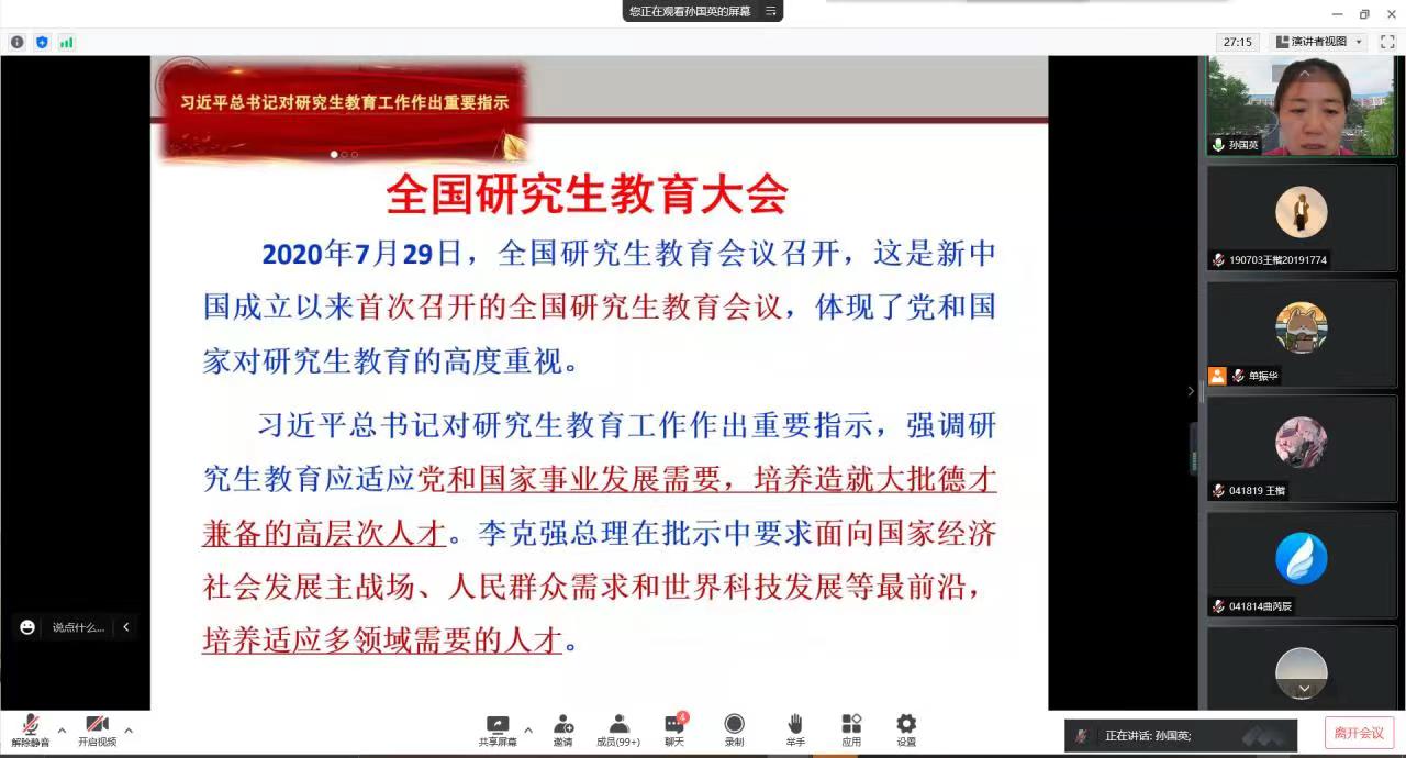 召开线上考研说明会暨优秀学子经验分享会,会议由学院副院长孙国英主讲,辅导员侯天放主持会议。2018级考研优秀学生代表进行了经验分享,2019级、2020级全体同学参加了会议。