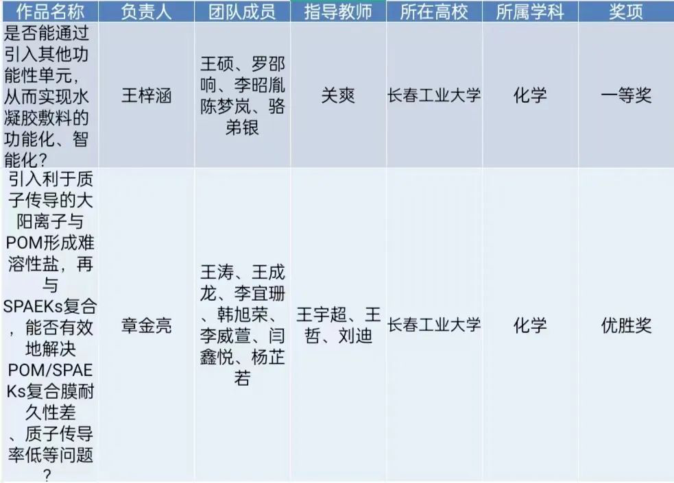 关爽老师指导、王梓涵等同学完成的《是否能通过引入其他功能性单元,从而实现水凝胶敷料的功能化,智能化?》获得一等奖,王宇超老师指导、章金亮等同学完成的《引入利于质子传导的大阳离子与POM形成难溶性盐,再与SPAEKs复合,能否有效地解决POM/SPAEKs复合膜耐久性差、质子传导率低等问题?》荣获优胜奖!