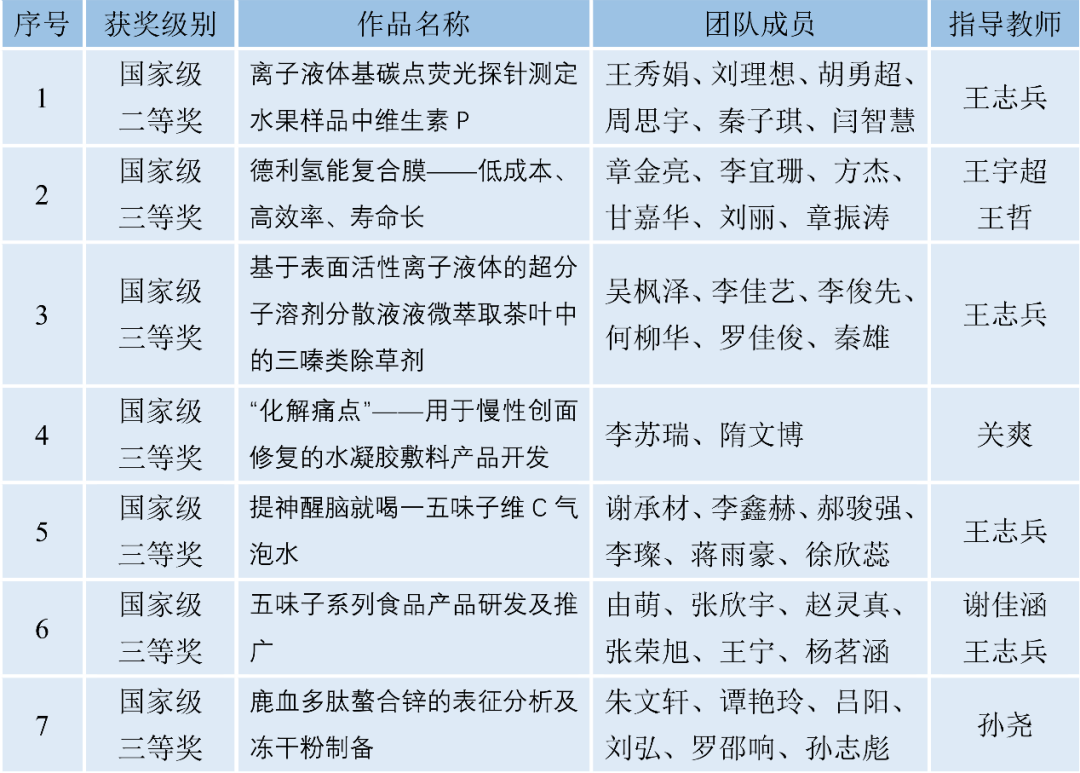 王志兵老师指导,王秀娟等同学完成的《离子液体基碳点荧光探针测定水果样品中维生素P》荣获国家级二等奖,由王宇超和王哲老师共同指导、章金亮等同学完成的《德利氢能复合膜——低成本、高效率、寿命长》等6项作品荣获国家级三等奖。另外,我校参赛团队还荣获省级一等奖1项、二等奖6项、三等奖6项。