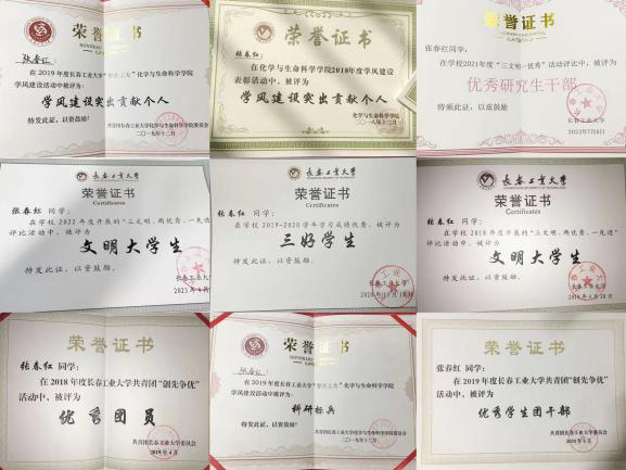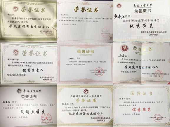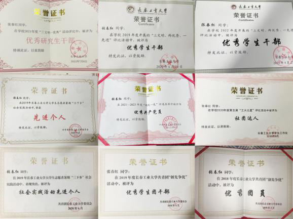 “工大之星”荣誉称号、校“文明大学生”、校“优秀学生干部”、校“优秀研究生干部”、校“优秀团干部”、校“优秀团员”等荣誉称号20余次;