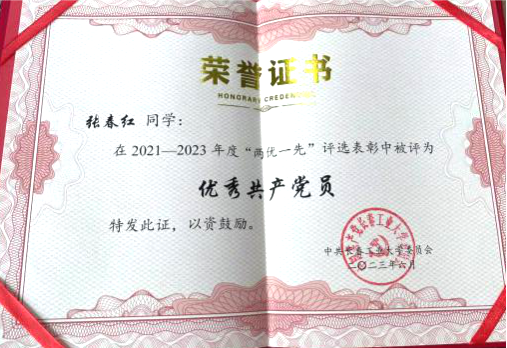 研究生党支部副书记以来,做好党支部的宣传与组织工作,深入学习贯彻习近平新时代中国特色社会主义思想和党的二十大精神,理想信念坚定,她主持“深入学习党的二十大报告”主题党日活动等各类党内活动40余项,同时负责e支部的维护工作,在e支部累计发表新闻50余篇,所在支部年度考核均为优秀,获评校“优秀共产党员”荣誉称号。