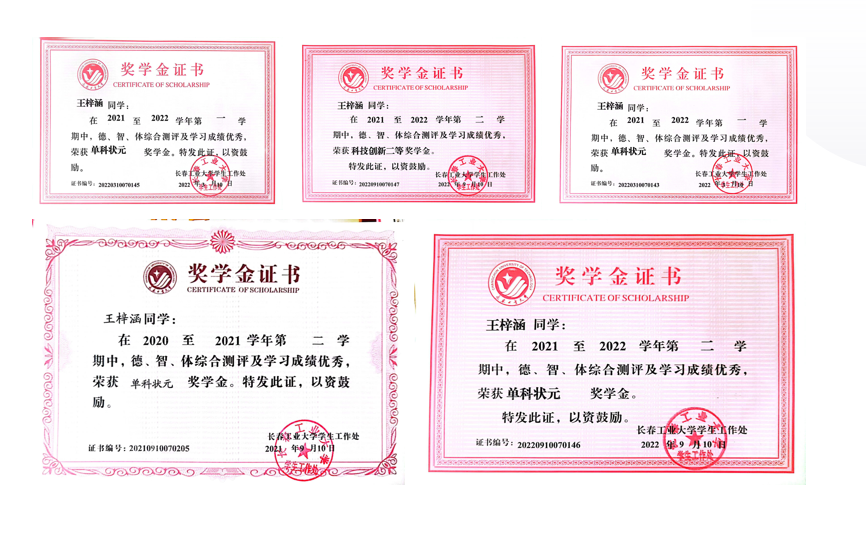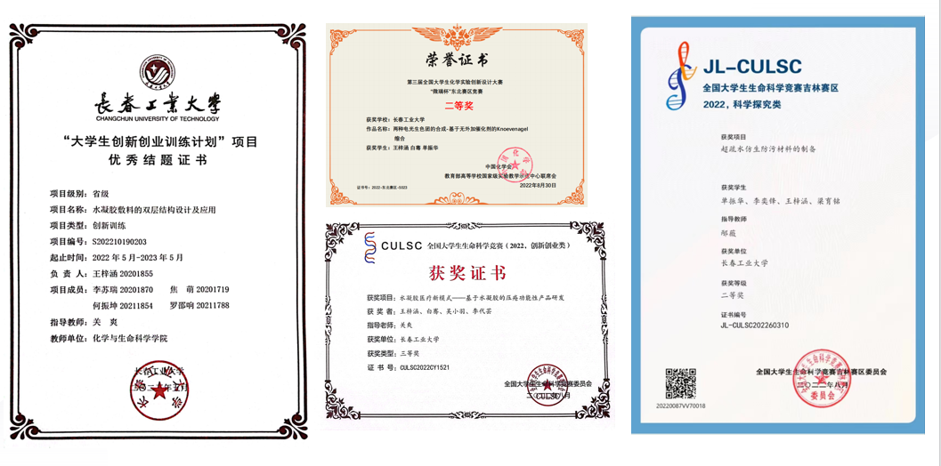 我深知"学问未必全在书本上",也因此十分注重培养自身实践能力以及全方位思考能力,我认为大学的学习不仅仅限于课本知识,也更应该将自己所学的理论知识转化为实践,课下我经常去老师的实验室,将自己在课堂上学习到的理论应用到实践当中。通过与师兄师姐他们的交流探讨,我对于自身的专业有了更加深刻的认识,也学会了更加科学、系统的分析问题。一方面我主持了一项省级大学生创新训练项目《双层水凝胶的设计与应用》作为项目负责人,并在2023年获得优秀结题。同时,我在老师的指导下作为第二作者撰写论文《A Double-Layer Hydrogel Dressing with High Mechanical Strength and Water Resistance Used for Drug Delivery》于2023年1月发表在《molecules》杂志(IF:4.6)。另一方面我积极主动尝试学科间的相融,我通过参加全国大学生生命科学竞赛丰富了自己在生物类学科方面的经验。这些丰富的科研经历进一步提升了自己的科研学术水平,也使我领悟到学术研究的独特魅力。除此之外我多次参加各种学科竞赛,荣获生命科学竞赛国家级奖项2项、大学生创新创业项目省级一项、全国大学生化学实验创新设计大赛省级一项等荣誉。