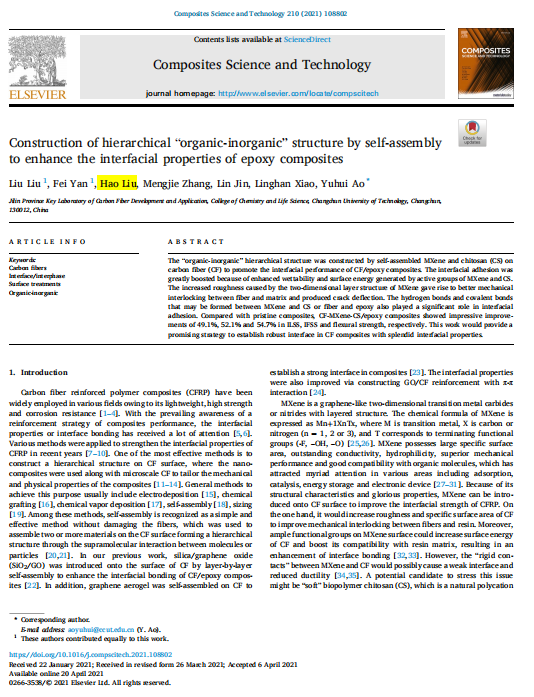 “天道酬勤”是沉淀在科技工作者基因血脉里的朴素信仰。在一个个平凡的日出日落间,一幕幕平常的实验场景中,大家都能看到刘浩同志的身影。作为一名理工类专业学生,她怀揣科技报国的理想追求。科研方面,在老师的指导下,该同志在本科期间就积极参与教师课题组科研项目,参与省级科创项目两项,以合著者身份在国际复合材料领域顶级期刊《Composites Science and Technology》(IF:9.1)上发表Construction of hierarchical “organic-inorganic” structure by self-assembly to enhance the interfacial properties of epoxy composites论文;在《Composites Part-B》(IF:13.1)上发表Water-based PEKC-COOH sizing agent for enhancing the interfacial adhesion of carbon fiber/polyether-ether-ketone composites论文。以项目负责人身份完成2021年度亚洲色图