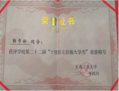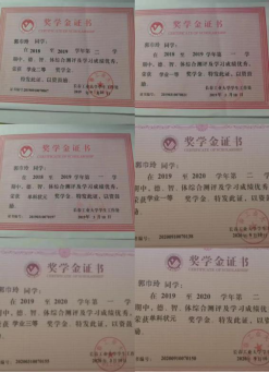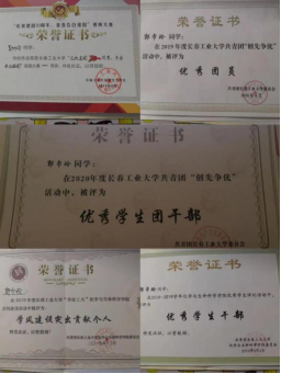 第二十二届“十佳自立自强大学生”、获得校第十六期青马班培训“优秀学员”、校“文明大学生”荣誉称号、校“优秀团干部”、校“优秀团员”,院“优秀学生干部”“学风建设突出贡献个人”等。在学院内开展学习经验分享会,分享学习心得,考研心得,帮助学弟学妹们复习方向及方法,激发同学们学习的热情。