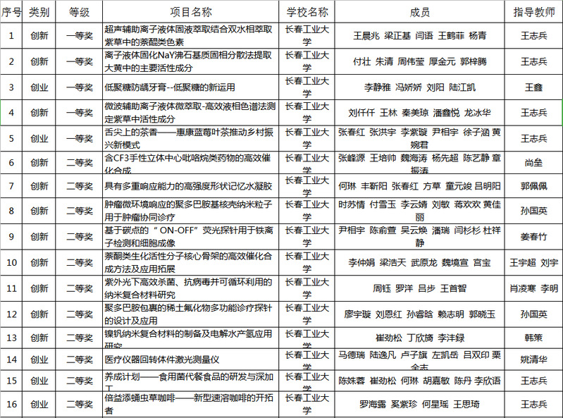 本届大赛自2019年9月启动,历时1年;覆盖全国32个省(直辖市)、自治区的302所高校3687支队伍;14000余名学生参赛;经过资格审查、网络评审、“云”答辩,共评选出学生和指导教师特等奖38项、一等奖395项、二等奖544项、三等奖674项。我校通过层层选拔,激烈的角逐,最终,由亚洲色图 王志兵老师指导,王晨兆、梁正基等同学完成的《超声辅助离子液体固液萃取结合双水相萃取紫草中的萘醌类色素》项目,付壮、朱清等同学完成的《离子液体固化NaY沸石基质固相分散法提取大黄中的主要活性成分》项目,刘仟仟、王林等同学完成的《微波辅助离子液体微萃取-高效液相色谱法测定紫草中活性成分》项目荣获创新组一等奖;由王志兵老师指导,张春红等同学完成的《舌尖上的茶香——惠康蓝莓叶茶推动乡村振兴新模式》项目,以及由王鑫老师指导,李静雅等同学完成的《低聚糖防龋牙膏--低聚糖的新运用》项目荣获创业组一等奖。