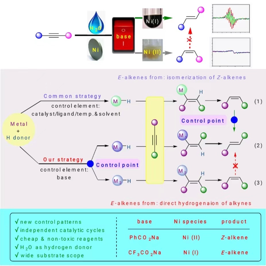 刘宇课题组以金属物种调控策略实现了Ni催化的炔烃转移氢化反应,水是体系中唯一的氢源。机理研究表明,碱的巧妙选用导致了不同价态活性Ni物种的生成,形成的Ni(II)物种可经催化循环得到顺式烯烃,而Ni(I)物种则选择性地生成反式烯烃,进而以完全独立的催化路径分别得到不同构型的烯烃产物。反应体系使用的均为廉价催化剂和无毒试剂,与各种内炔、末端炔、1,3-烯炔和二炔等各种炔烃底物的兼容性良好。这份研究工作发展了一种新颖的高选择性炔烃半氢化策略,底物普适性广泛,机理研究详尽,为镍催化体系乃至其他过渡金属催化体系的反应设计和机理研究提供了更多的可能性。
