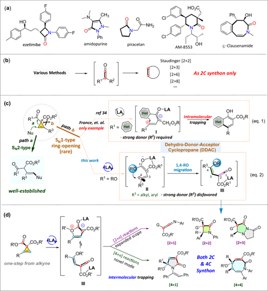 烯酮中间体化学在杂环药物的高效构建中发挥了重要作用,诞生了如Staudinger [2+2]反应等知名的人名反应。但120年来,烯酮化学局限于烯酮作为2C合成子的[2+n]型反应模式,成为制约其发展的瓶颈之一。赵金钵教授团队在关注很少的环丙烯的“推-拉”型开环中,发现了一种经历分子内1,4-烷氧基迁移的新型开环方式,得到一种亲电的烯基烯酮。该烯酮中间体与各种氮、氧亲核试剂反应时,除传统的[2+n]环化模式外,还展示出了全新的“插烯”型[4+n]环化模式,合成多种(4、5、6、8元)具有生物活性的内酰胺产物(下图)。本文的发现除了为烯酮构建新型内酰胺药物骨架提供了重要新模式外,也对“推-拉”电子体系化学和氮杂环化学具有重要的启发作用。