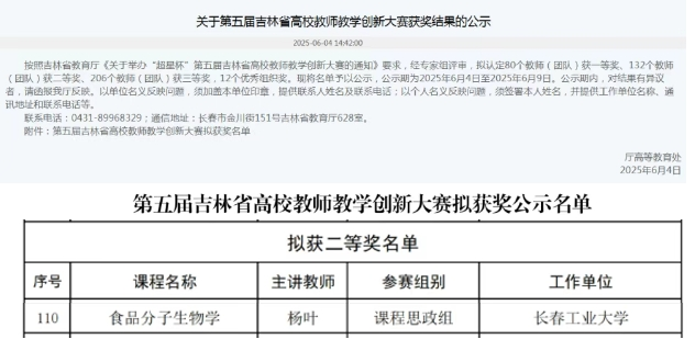 近日,吉林省第五届高校教师教学创新大赛决赛落下帷幕,我院杨叶老师凭借《食品分子生物学》课程的创新教学实践,在课程思政组中脱颖而出,斩获省级二等奖! 这是学院在该赛事中首次晋级决赛取得的最佳成绩,实现了历史性突破!