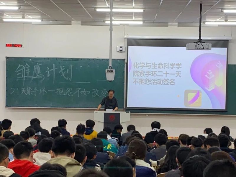 于北湖校区西区西阶201教室开展“21天紫手环—抱怨不如改变”活动,2020级全体新生参与其中。