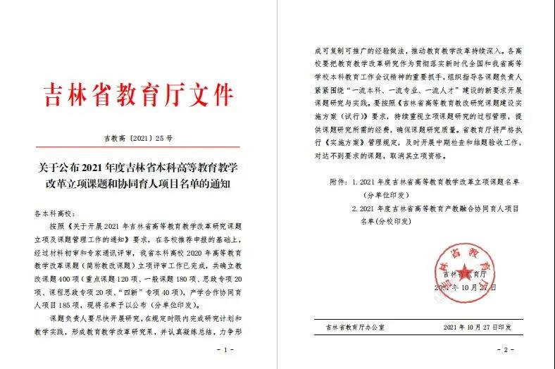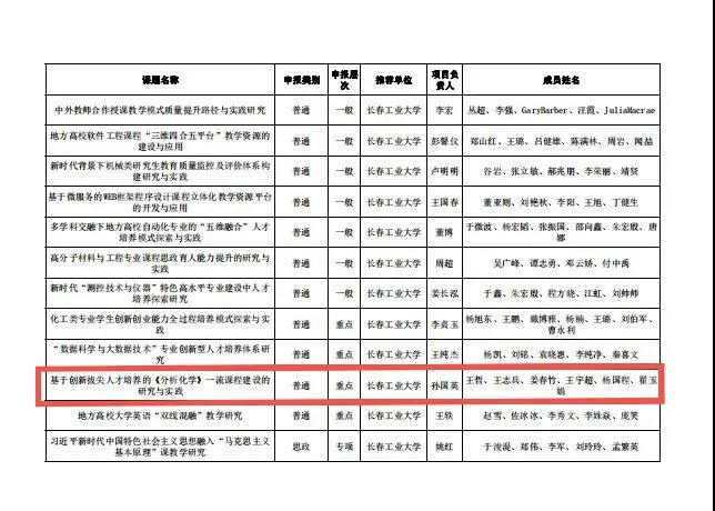 近日,吉林省教育厅公布了2021年度吉林省本科高等教育教学改革立项课题名单,由亚洲色图 副院长孙国英教授主持的“基于创新拔尖人才培养的《分析化学》一流课程建设的研究与实践”获得立项,并被列为重点项目!