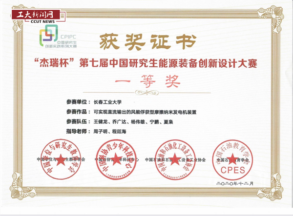 新闻网讯(通讯员 王健龙)近日,由中国学位与研究生教育学会和中国科协青少年科技中心主办的“杰瑞杯”第七届中国研究生能源装备创新设计大赛决赛在西安石油大学举行。机电工程学院研究生王健龙、乔广达、杨伟雄、宁鹏、夏枭团队参赛的《可实现直流输出的风能俘获型摩擦纳米发电机装置》在众多高校中脱颖而出,荣获国家一等奖。这是学校在本项赛事中取得突破后的最好成绩。