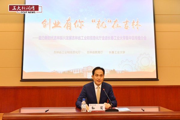 孙简在推介会上充分肯定了我校的办学成果和对吉林省工业经济发展的重要贡献,系统介绍了吉林省工业和信息化厅的主要工作职能、吉林省工业经济发展情况、吉林省围绕高校毕业生就业创业而制定的相关优惠条件及吉林省工业和信息化厅围绕大学生创业就业开展的创业载体建设、创业及技能人才培训和创新创业服务等一系列工作举措。他指出,吉林省工业现已形成以汽车、石化、农产品加工等为支柱产业,以装备、医药、冶金建材、电子信息等为优势产业,以节能与新能源汽车、先进轨道交通装备、生物医药及高性能医疗器械、卫星及通用航空、精密仪器与装备、CMOS等新一代信息技术、新材料为新兴产业的相互支撑、竞相发展的产业格局。多年来,工业经济一直保持稳定增长态势,为吉林经济社会发展提供了强大助力。他希望广大同学们积极投身于吉林工业经济建设中,在新时代吉林振兴发展中建功立业,以巨大的勇气、耐心和意志,赢得自己、赢得吉林、赢得中国社会的未来。