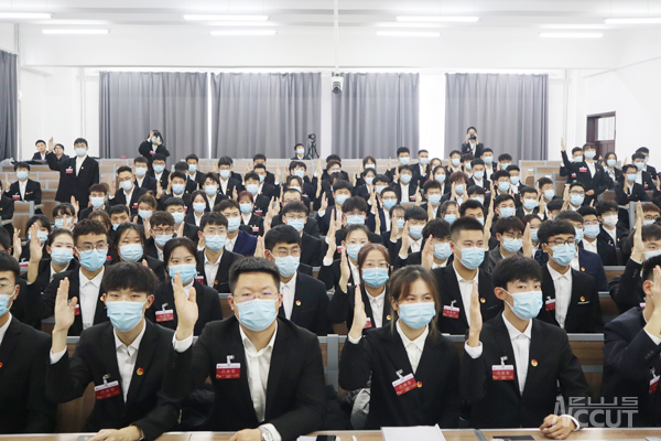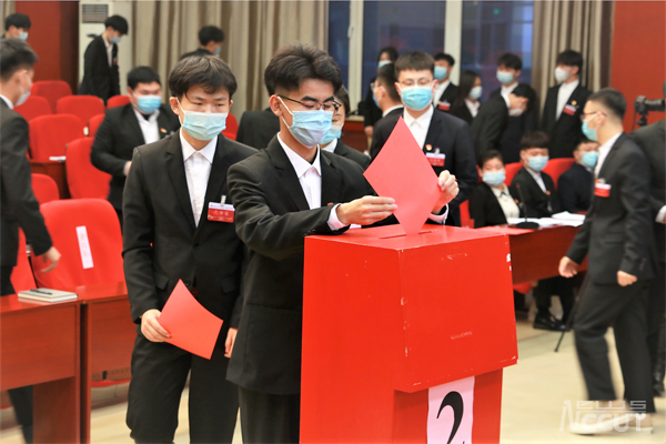 校团委书记仲崇利代表学校群团组织向大会致贺词。经济管理学院潘治元同学代表全体学生代表宣读大会倡议书。全体学生代表认真履职参会,行使代表权力。