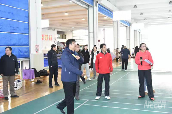 活动结束后,新一届羽毛球协会组织进行了职工联队与体育教研部代表队友谊交流赛。校纪委书记吴成章为比赛开球。
