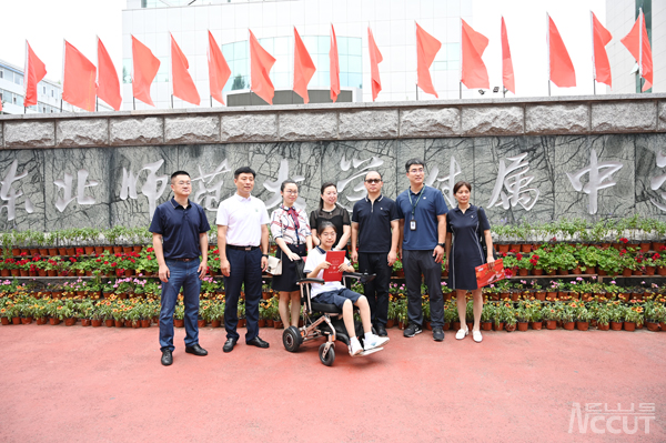 招生办公室主任杜娟带队,学生处副处长肖永辉及校党委宣传部新闻信息科科长张亮亮共同参加的“爱心通知书”派送团队,来到东北师范大学附属中学自由校区,将录取通知书送到赵桐同学手中。赵桐同学及其父母,东北师范大学附属中学校长邵志豪,赵桐所在年级主任王艳飞,校办主任张继辉,赵桐所在班级班主任田雪玲一起接待了派送团队一行。