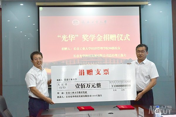 新闻网讯(通讯员 郑洪斌)在学校建校七十周年即将来临之际,我校经济管理学院90级优秀校友、长春光华科技发展有限公司总经理王逸夫捐资一百万元设立“光华”奖学金,助力我校教育事业发展。9月1日下午,学校在南湖校区主楼二楼会议室举行王逸夫校友捐赠暨客座教授聘任仪式。学校党委书记孙长智、校长张明耀热情接待王逸夫校友一行。仪式由党委副书记李东玲主持。校庆办相关人员、学校相关部门负责人、经济管理学院党政负责人参加仪式。